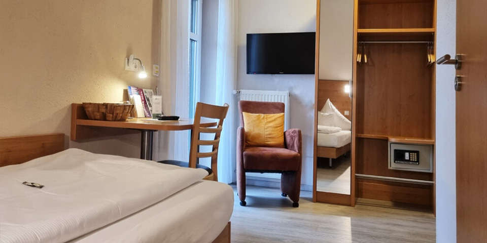 Alle Zimmer verfügen über einen Schreibtisch. SAT-TV, kostenfreies WLAN, Fön und Safe gehören zu unserer Ausstattung, sowie Handtücher und weiße Bettwäsche.