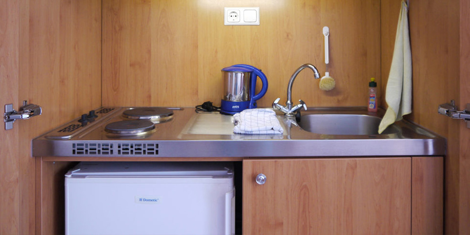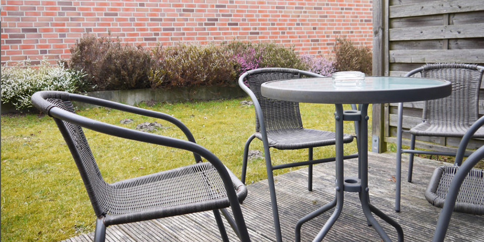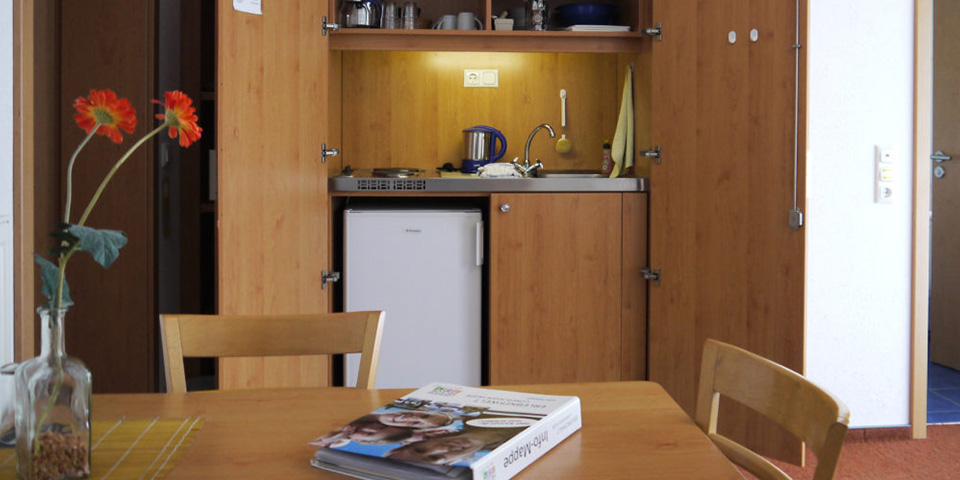 Die Ferienwohnung besteht aus einem Schlafraum mit Doppelbett und großzügigem Kleiderschrank, und einem Wohnraum mit Esstisch, gefliestem Kochbereich, Sessel und SAT-TV. Von hier aus gelangen Sie auf die zimmereigene Südterrasse in Richtung Böhmepark.